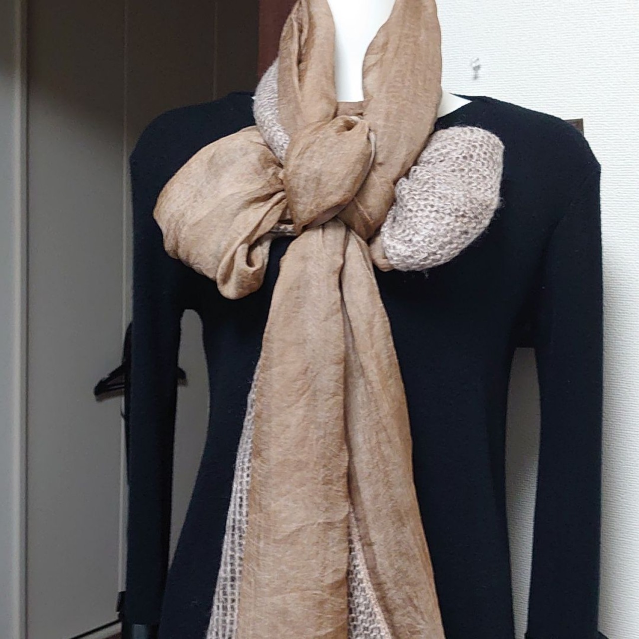 ストールの真ん中がウールで編んだ