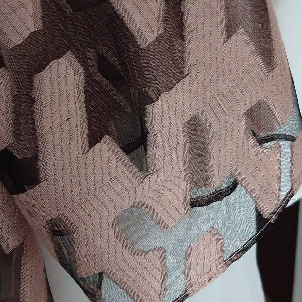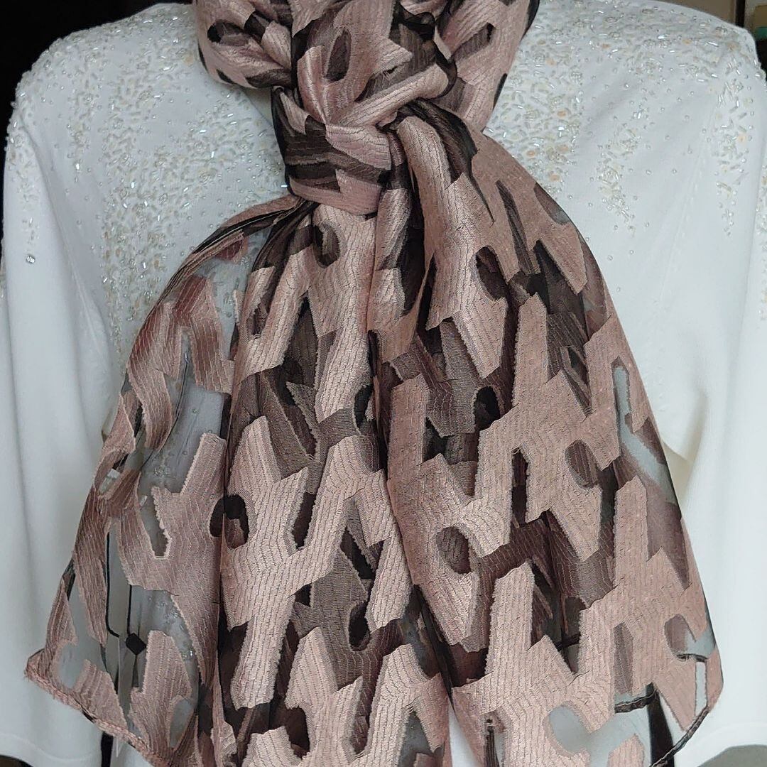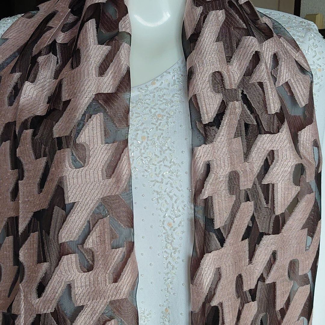 幾何学模様が織られ立体感があり、このストールを引き立てています。
