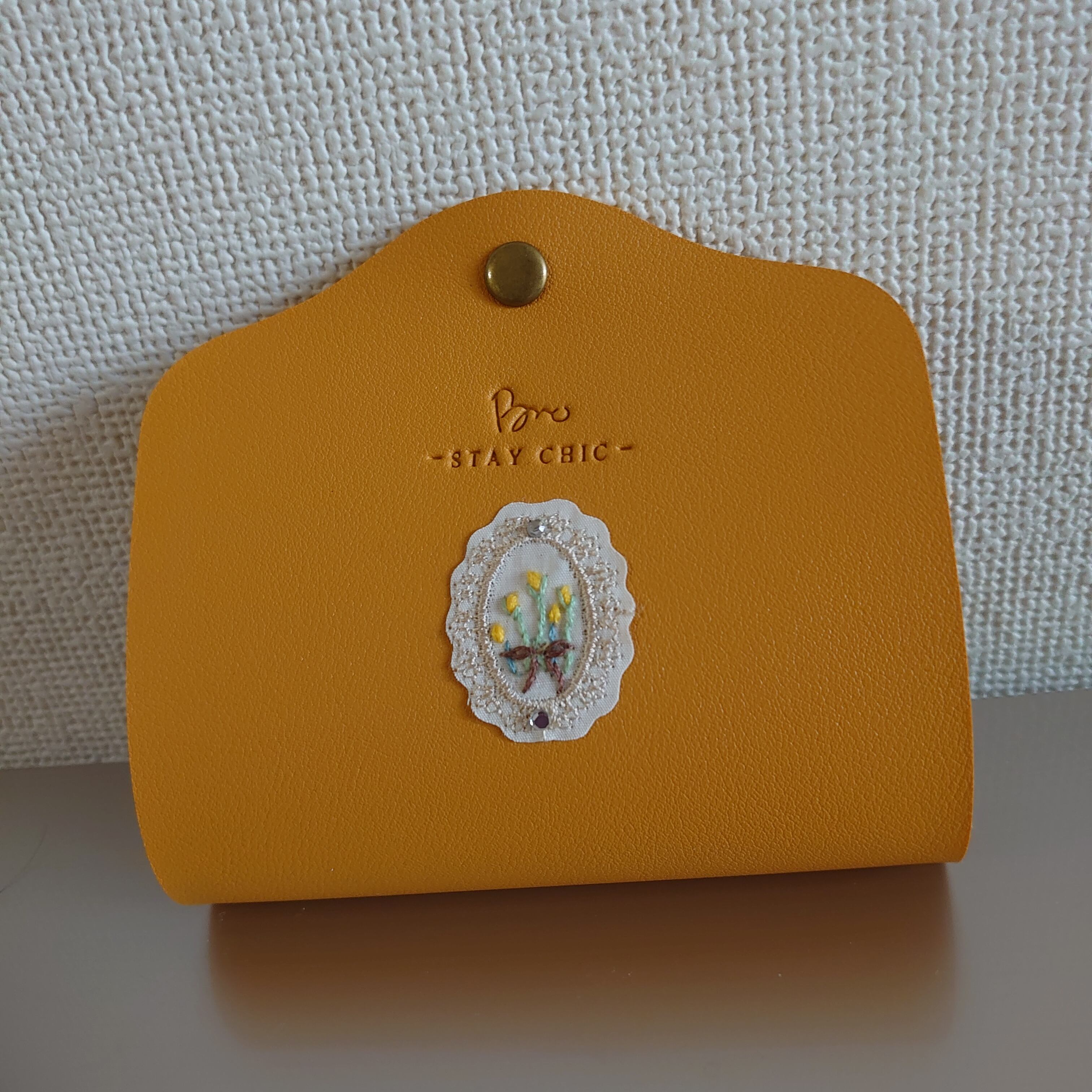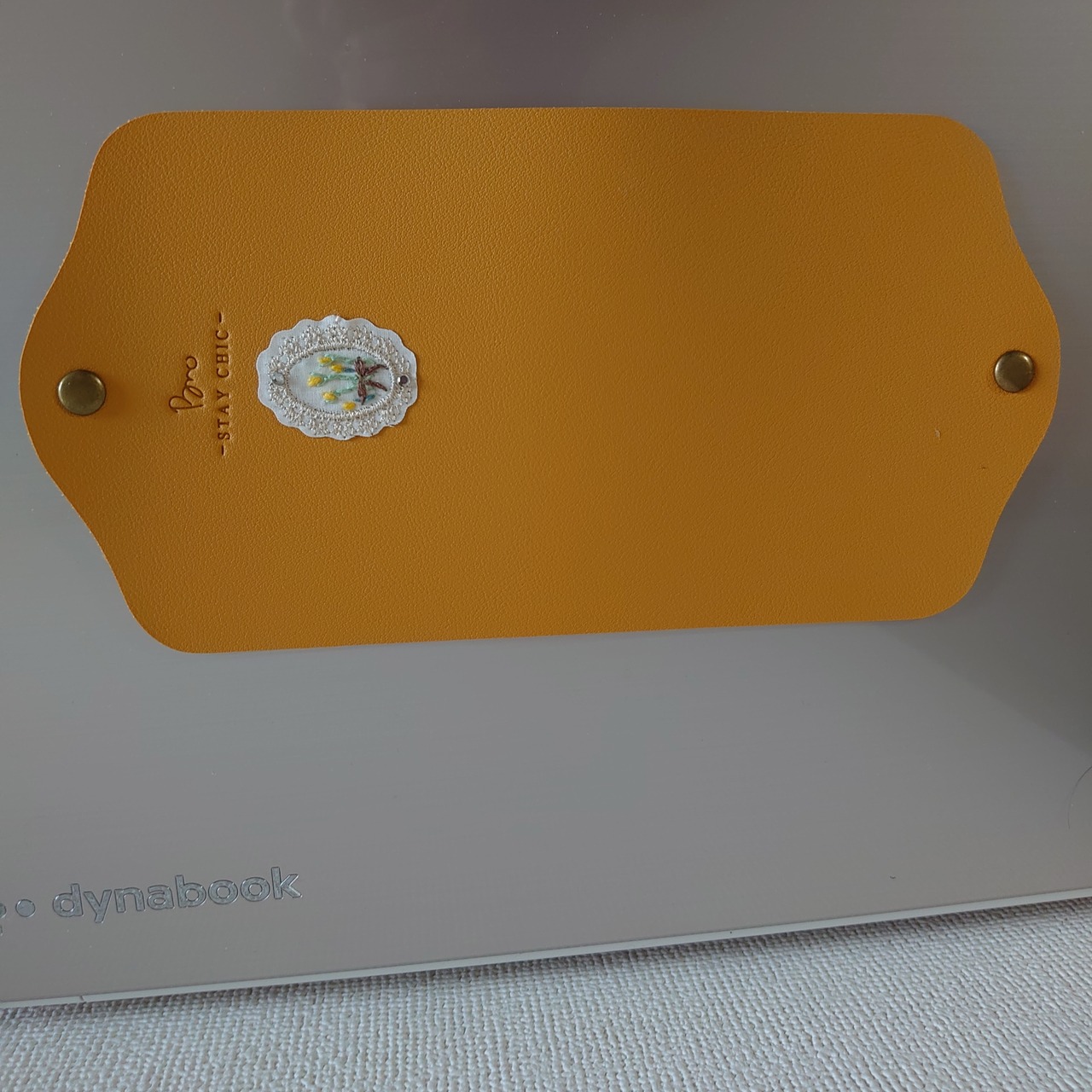 ♥ケースの黄色にお花を刺繍した楕円のレースを貼りました。レースの上下に小さなダイヤストーンを付けてあります。