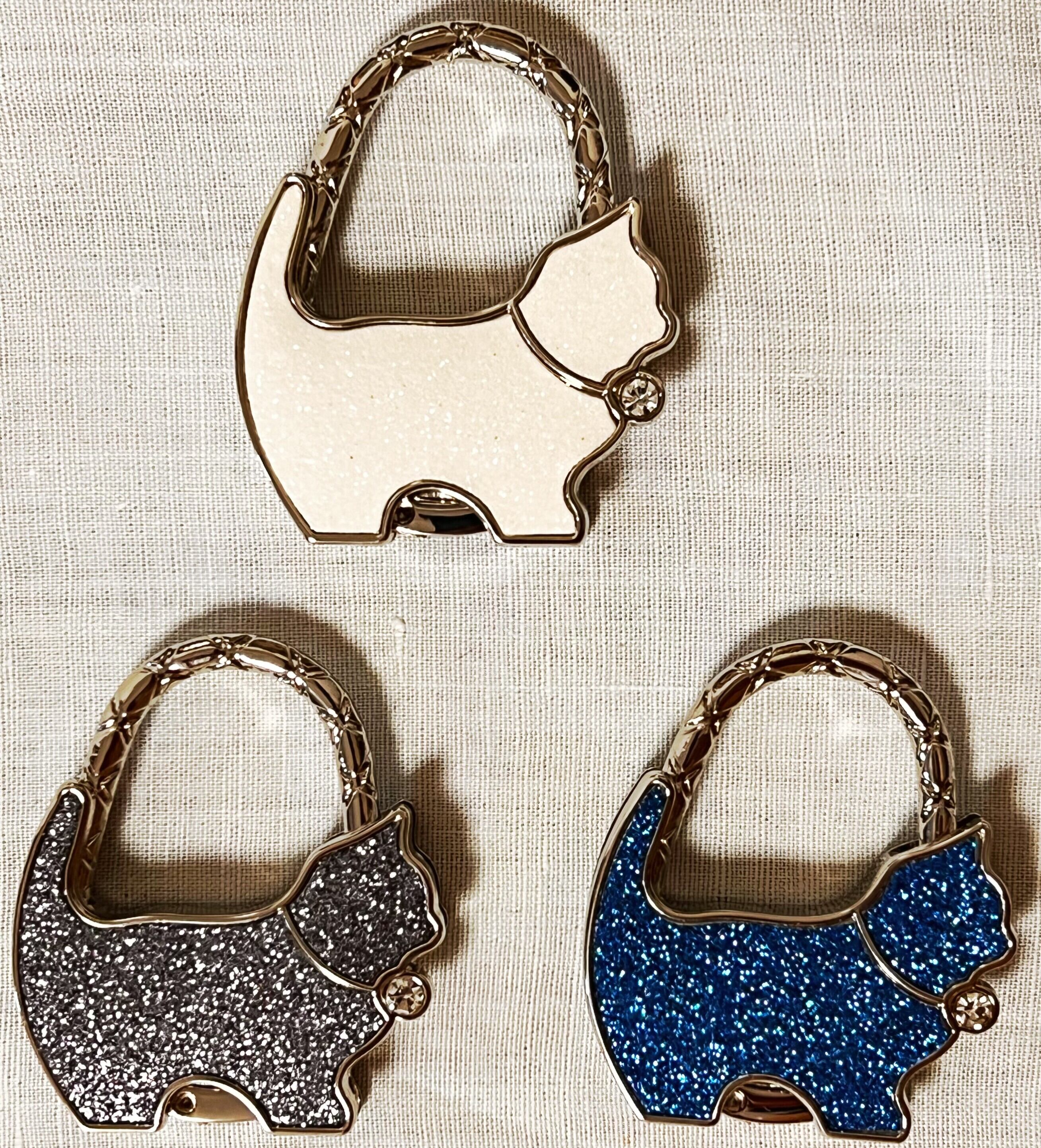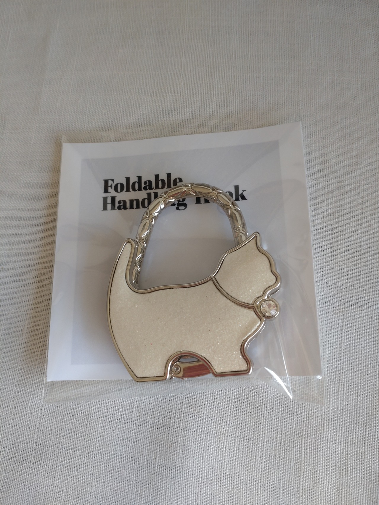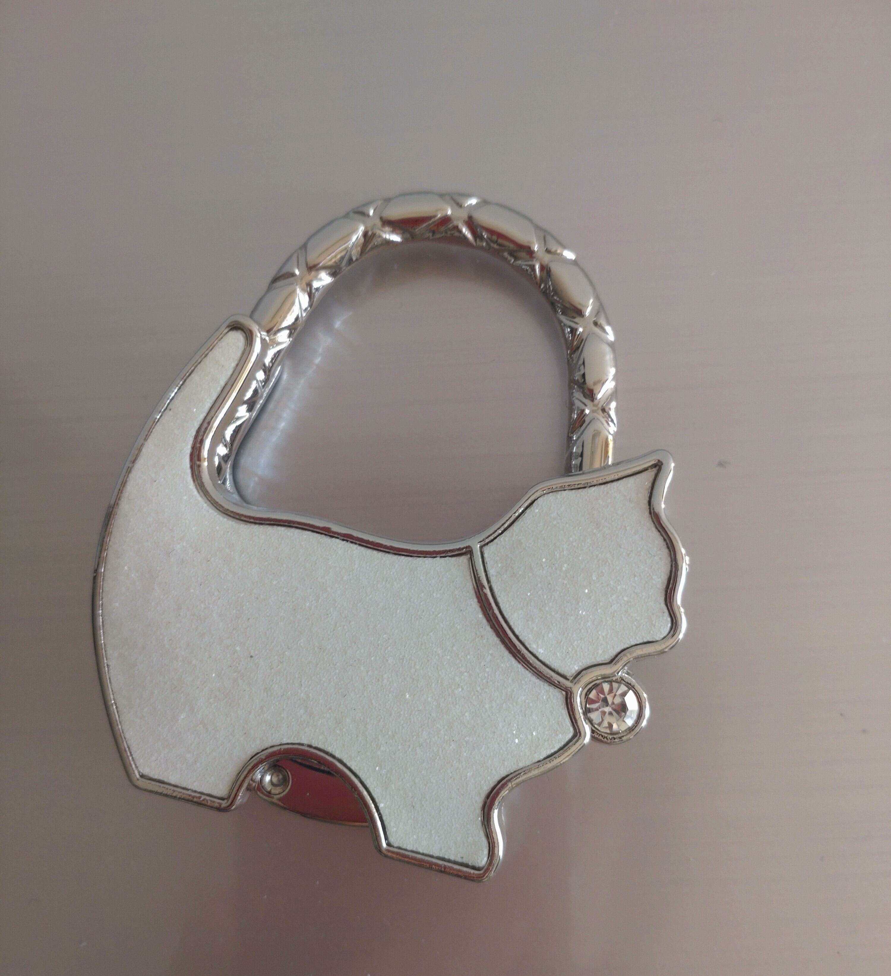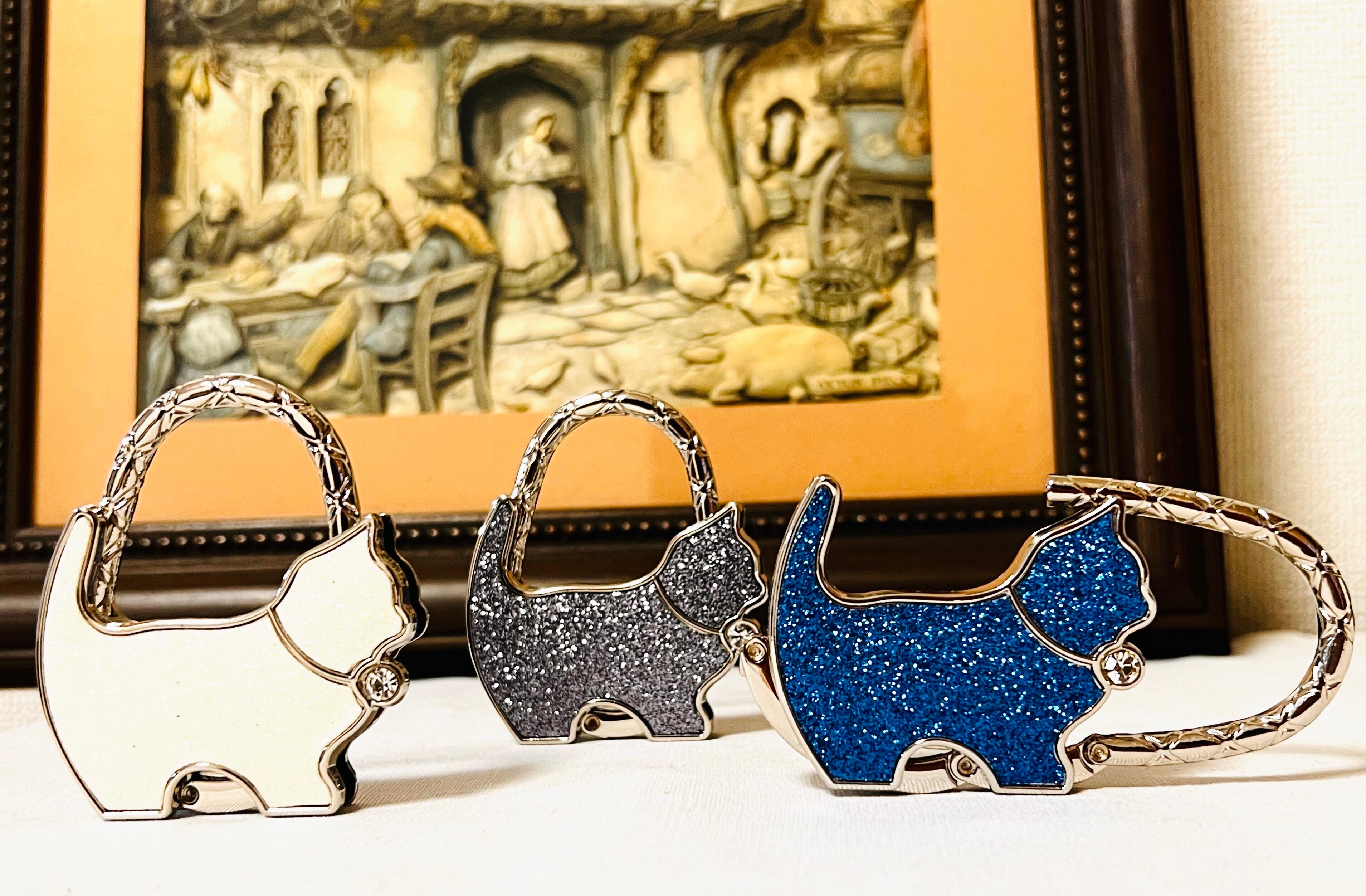 ❤白にラメの入った猫が、ダイヤのチョウカーをして可愛くゴジャスなバッグハンガーです。