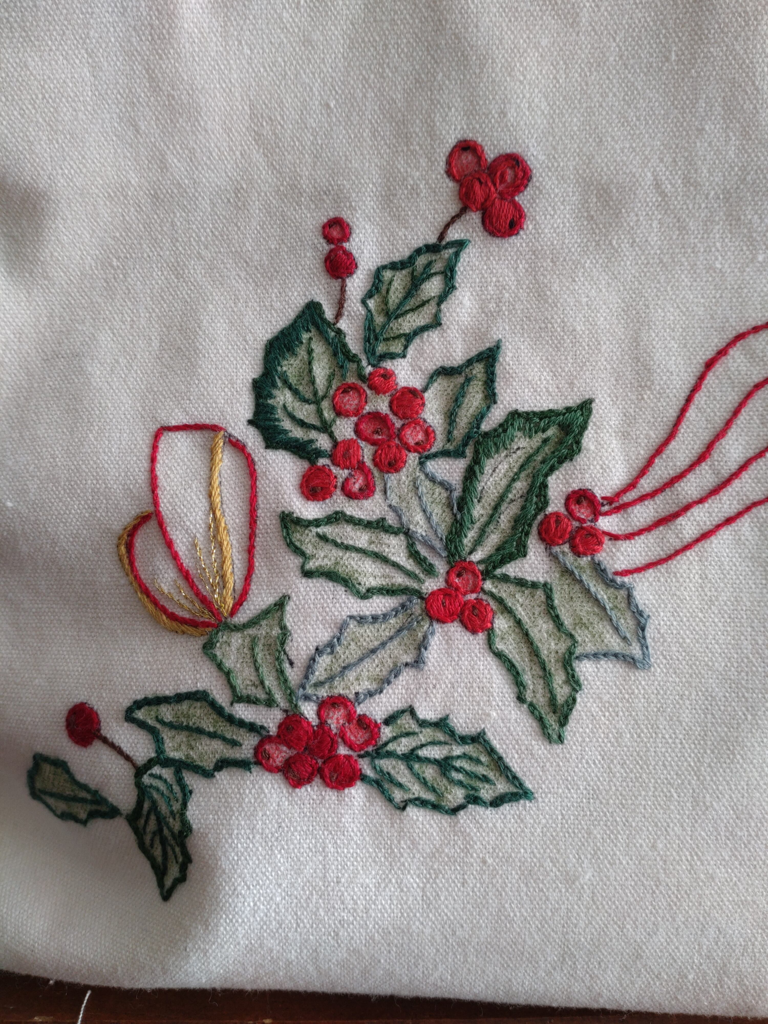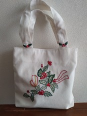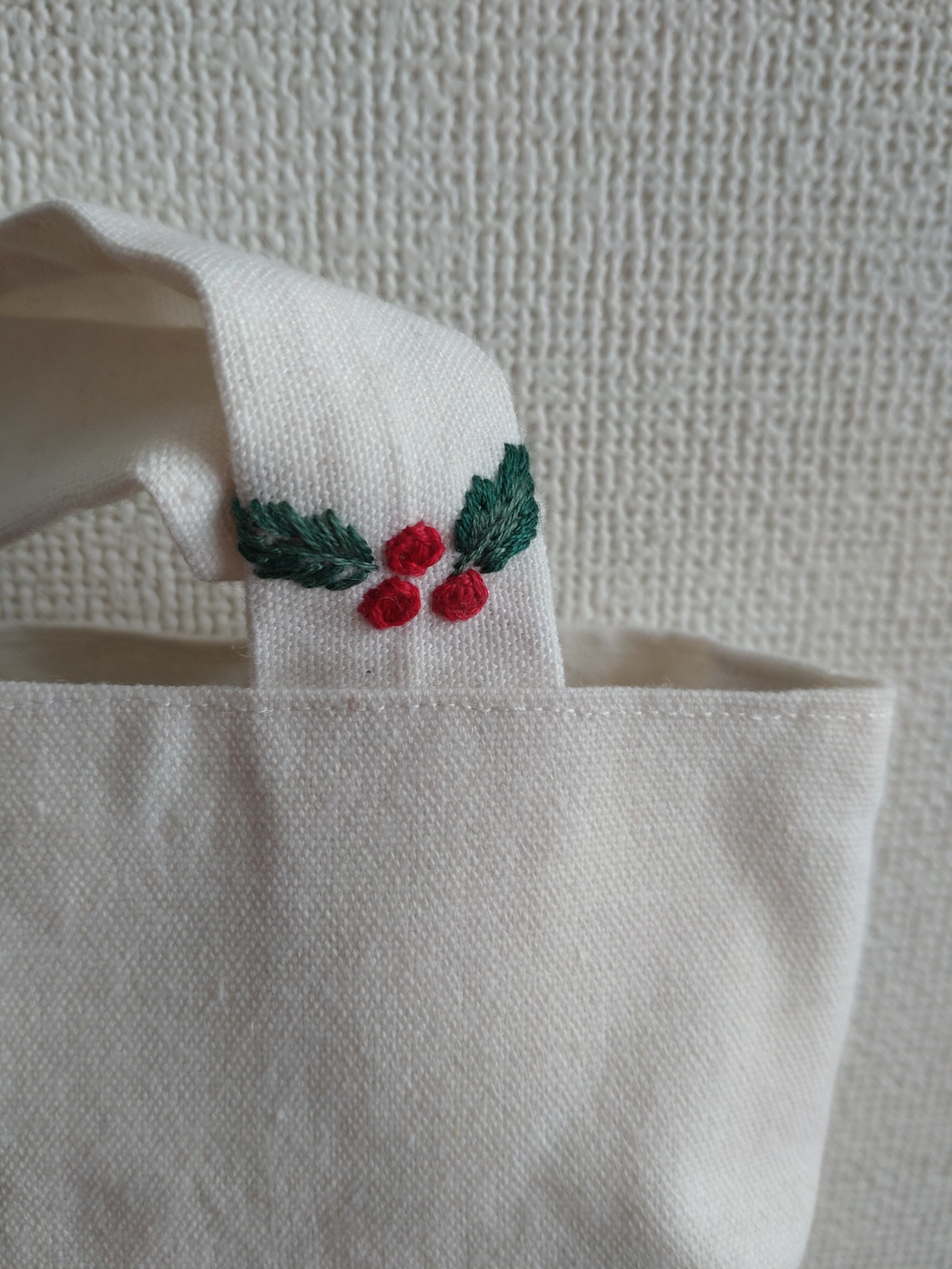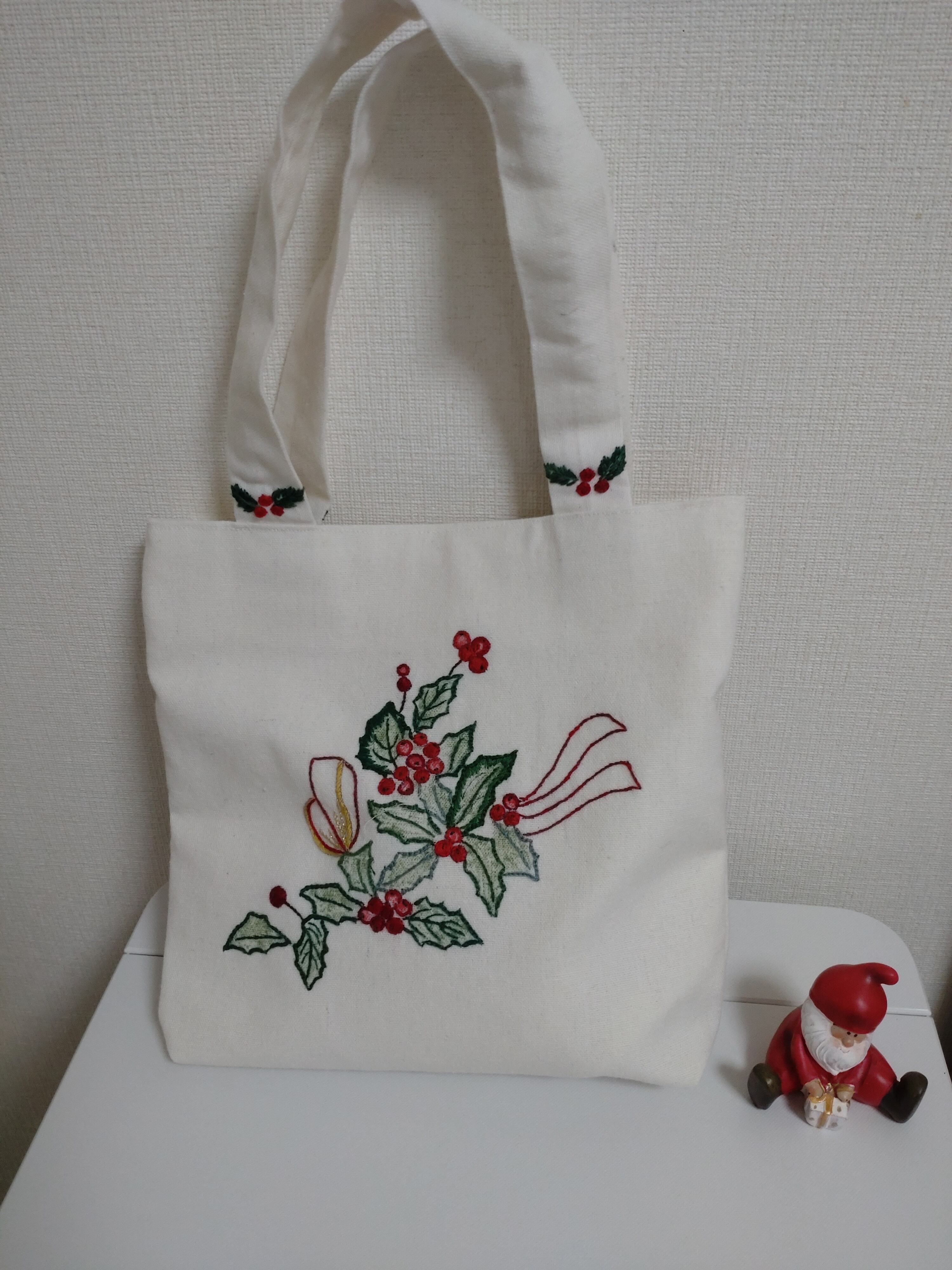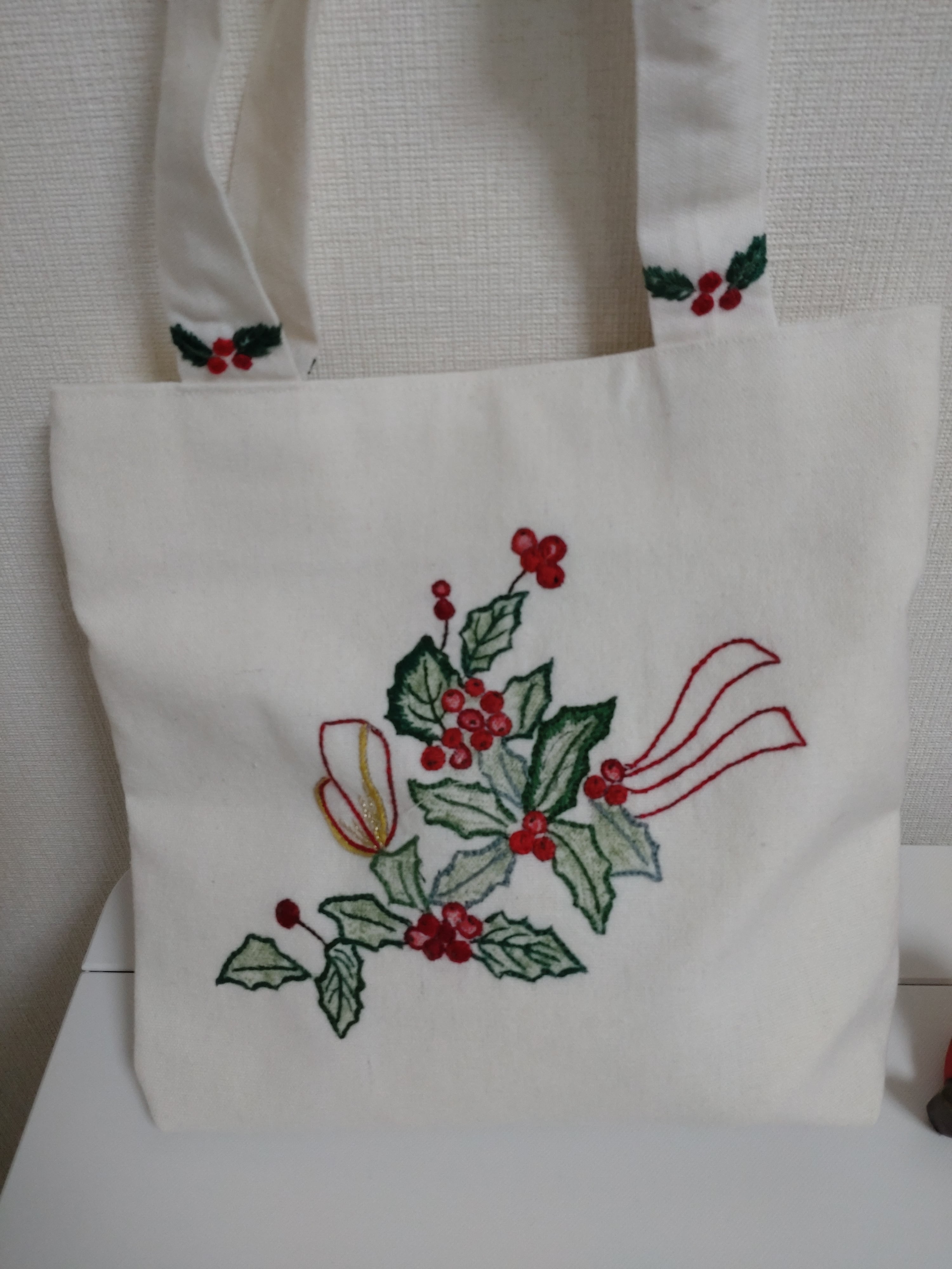 ❤クリスマスのトートバックにヒイラギを描き一針一針刺しました。