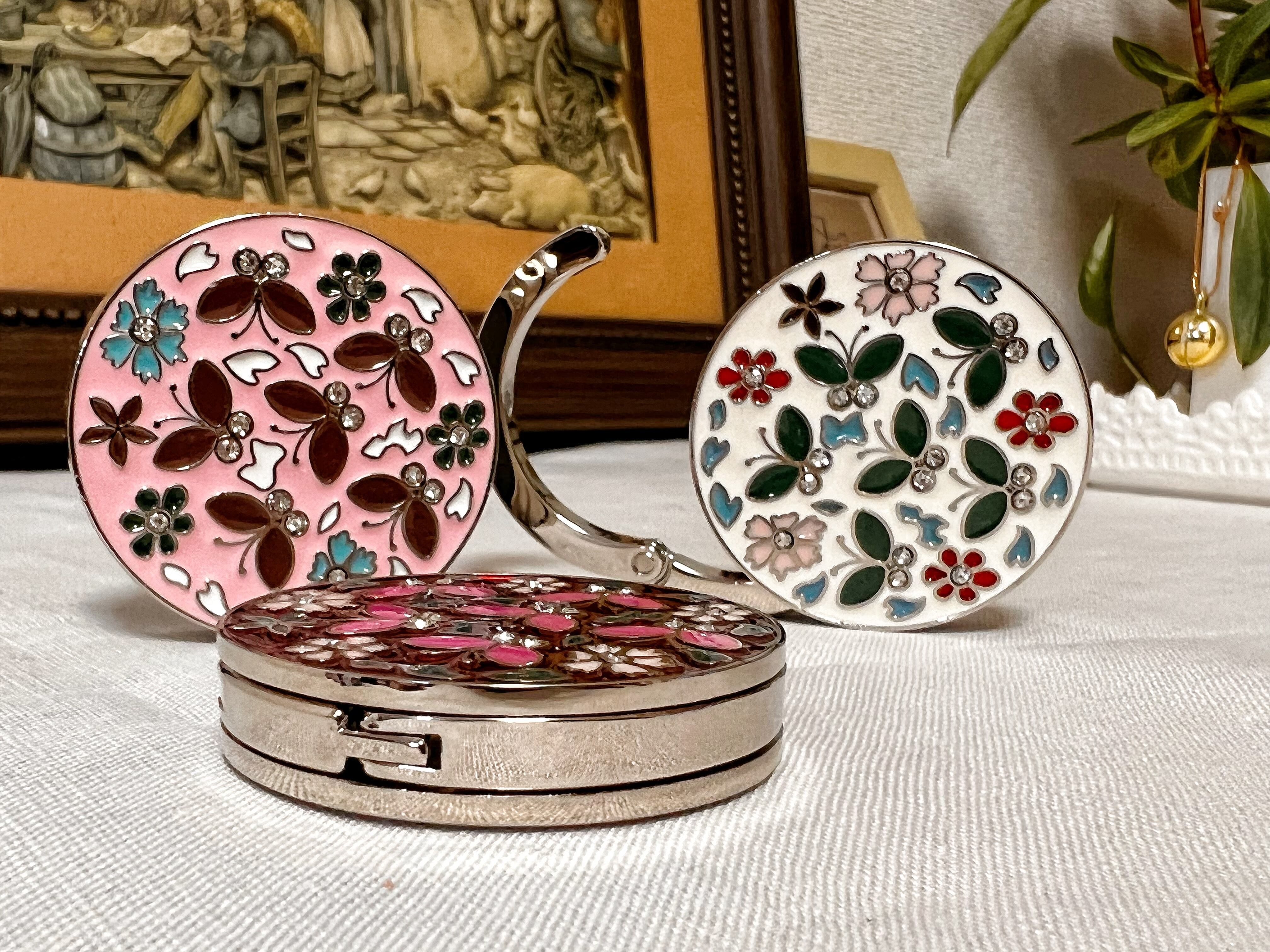 ❤ピンクの丸い形にワイン色のちょうちょにブルーの濃淡のお花に